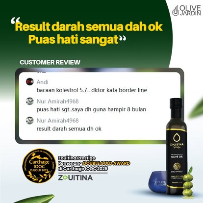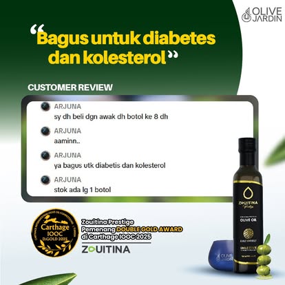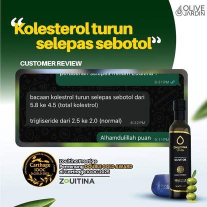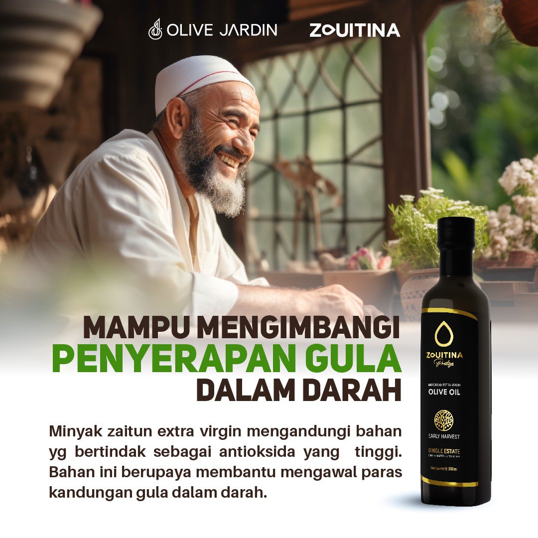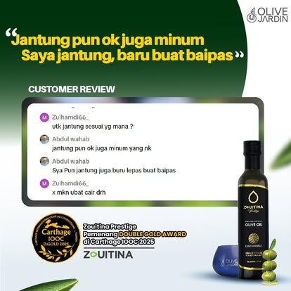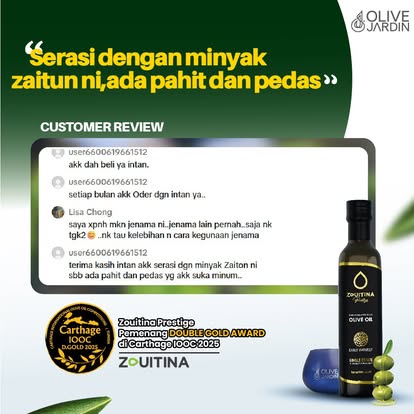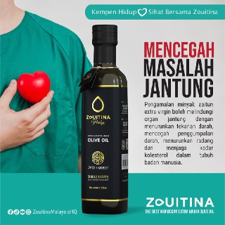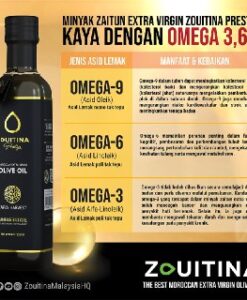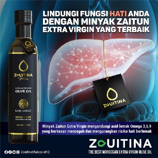 - Minyak Zaitun Zouitina Prestige ini adalah hasil daripada penuaian awal dan pemetik buah zaitun yang terpilih untuk menghasilkan kualiti minyak zaitun yang unik dengan aroma buah-buahan seperti pisang dan tomato masak 🫒