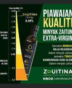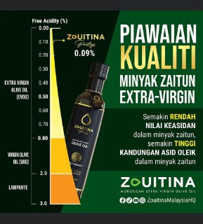- Nilai keasidan Minyak Zaitun Zouitina Prestige ini telah dibuktikan dengan menjalankan Analisis Kimia di Makmal Tello, Spain.